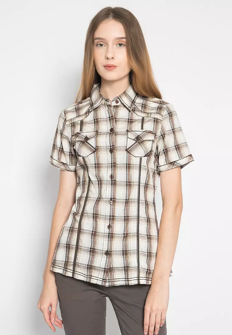 LGS - Kemeja Wanita Lengan Pendek - Full Kancing - Kotak-Kotak - Coklat Muda - LLSH.380.S965.253.7C