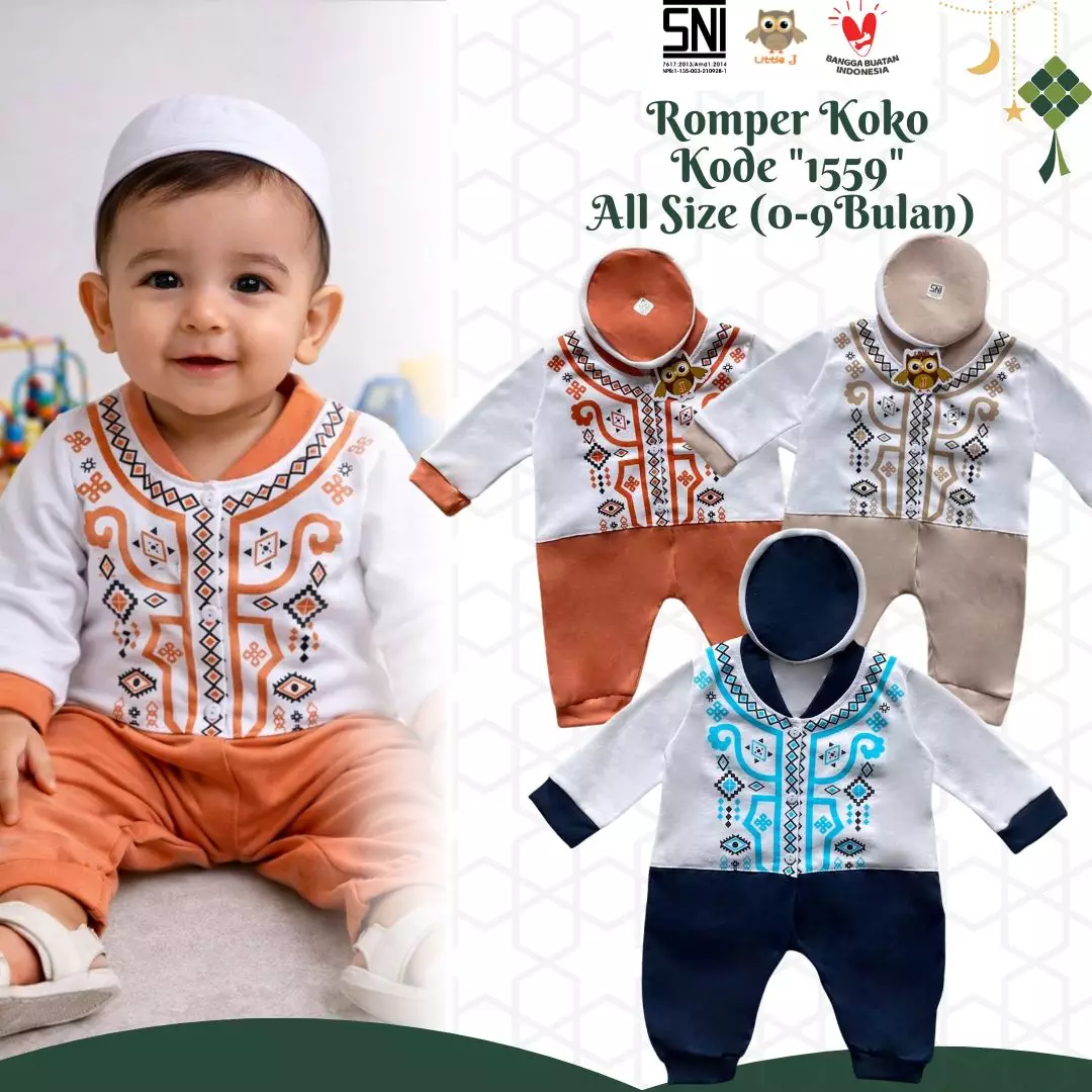 Little JLittle J - (1559) Raya Collection Romper Koko Baby Setelan Baju Koko Bayi SNI Muslin Cowok Jumper Koko 0-9 Bulan Peci Double Knitted Sablon Aplikasi Kudung 3 Kancing Hidup98000.00