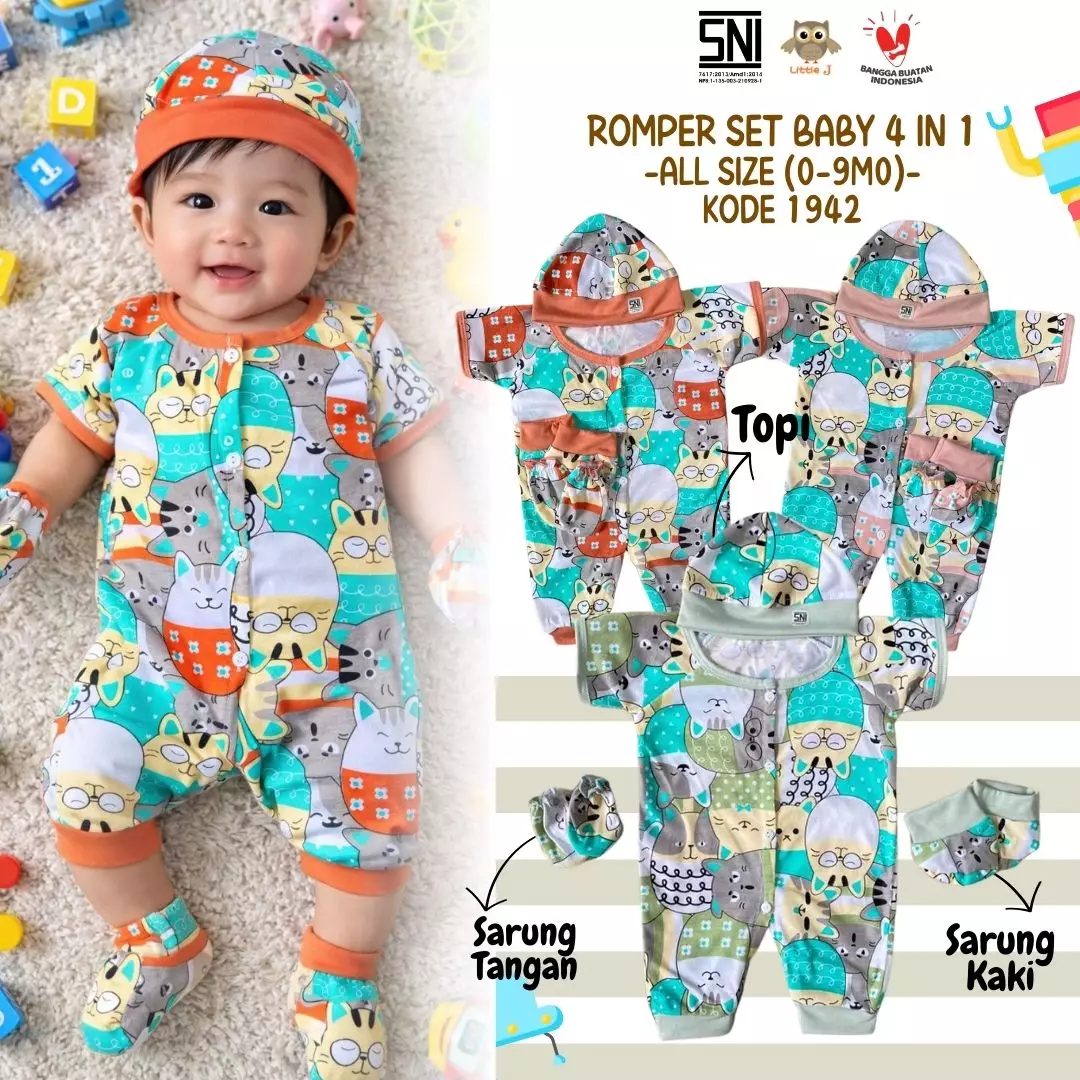 Little J - (1942) Romper Bayi Set Lengkap 4 in 1 | Baju Bayi Lengan Pendek + Topi + Sarung Tangan & Kaki