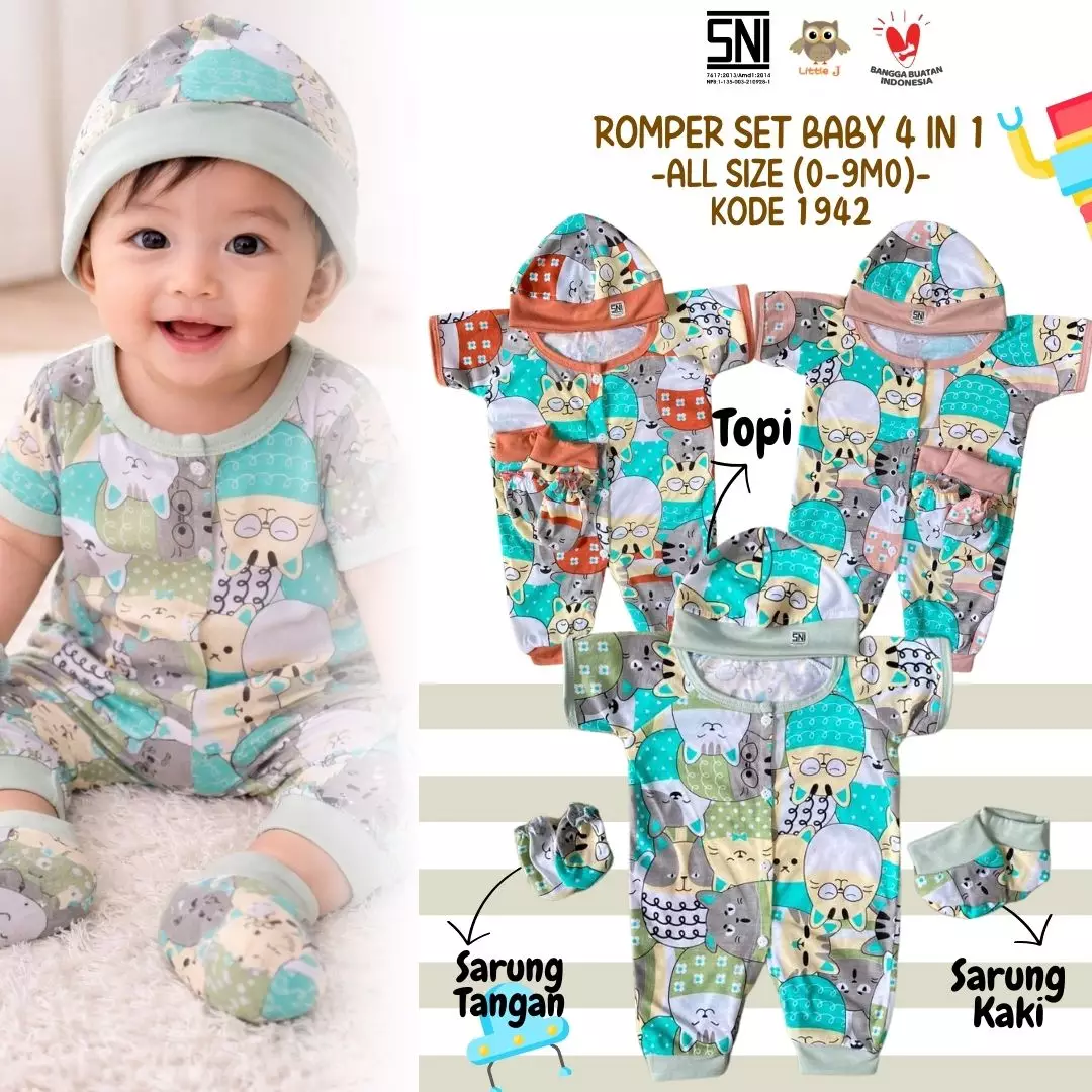Little J - (1942) Romper Bayi Set Lengkap 4 in 1 | Baju Bayi Lengan Pendek + Topi + Sarung Tangan & Kaki