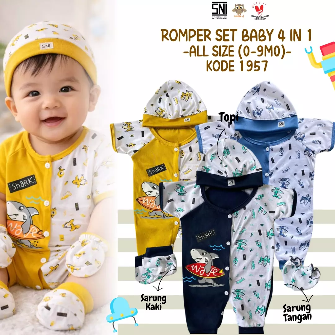Little J - (1957) Romper Bayi 4in1 Motif Shark Setelan Bayi Newborn 0-9 Bulan Baju Bayi Laki-Laki Set Topi Sarung Tangan Kaki