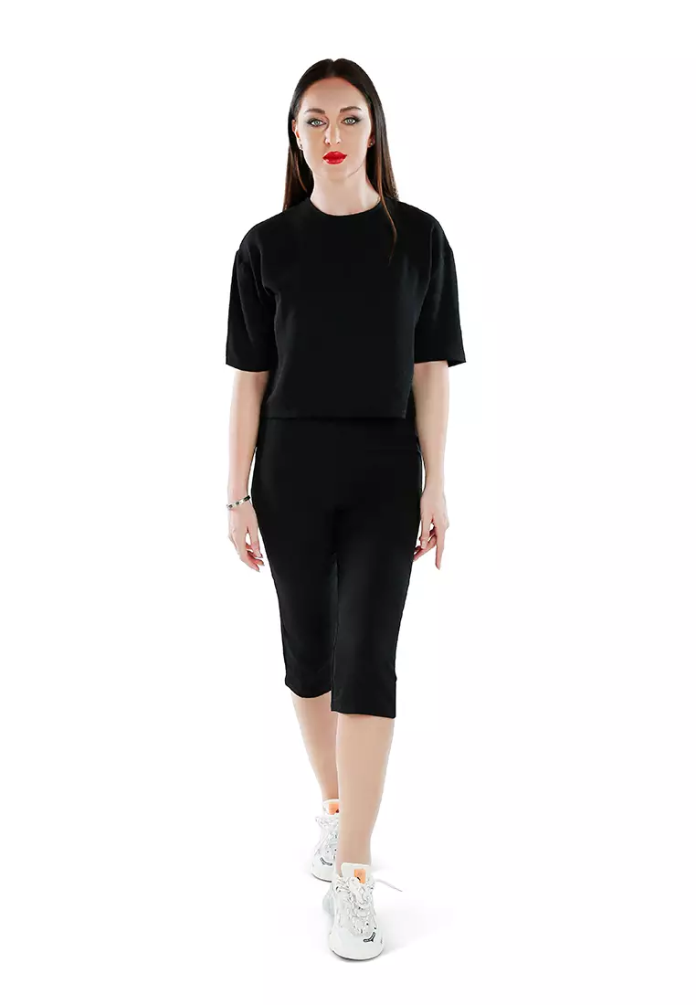 Atasan Pendek Lengan Pendek Hitam & Setelan Celana Capri Co Ord