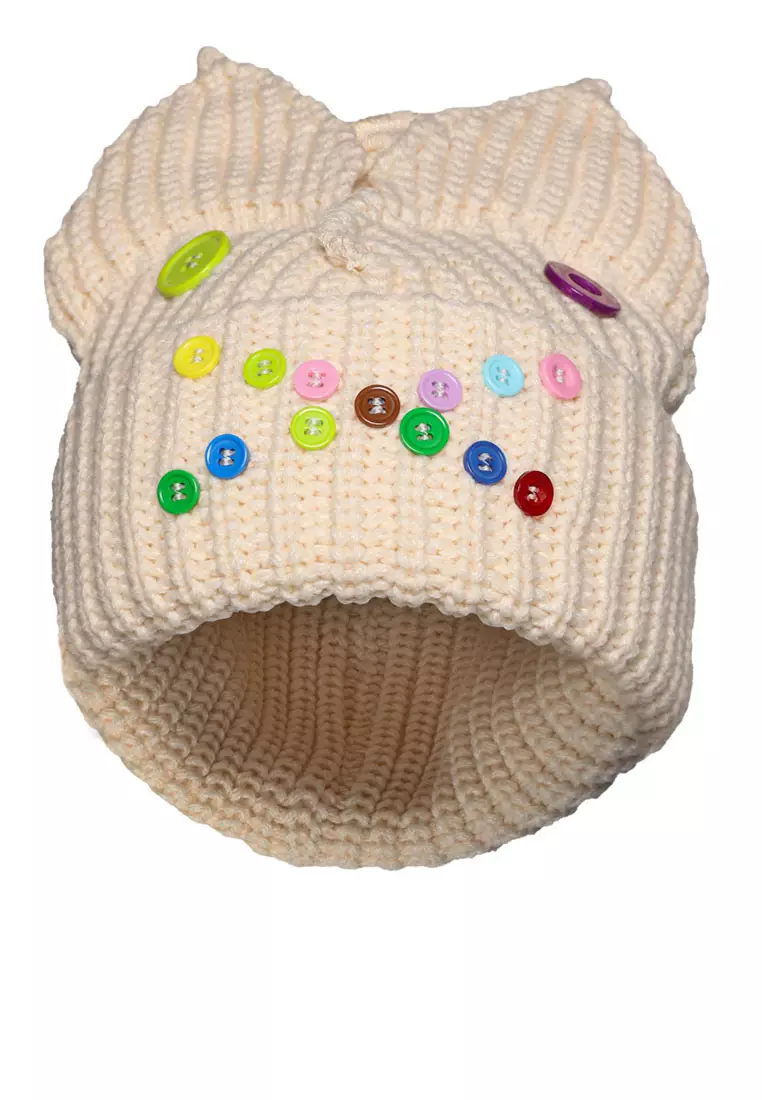 Beanie Telinga Hewan Berkancing Warna Putih