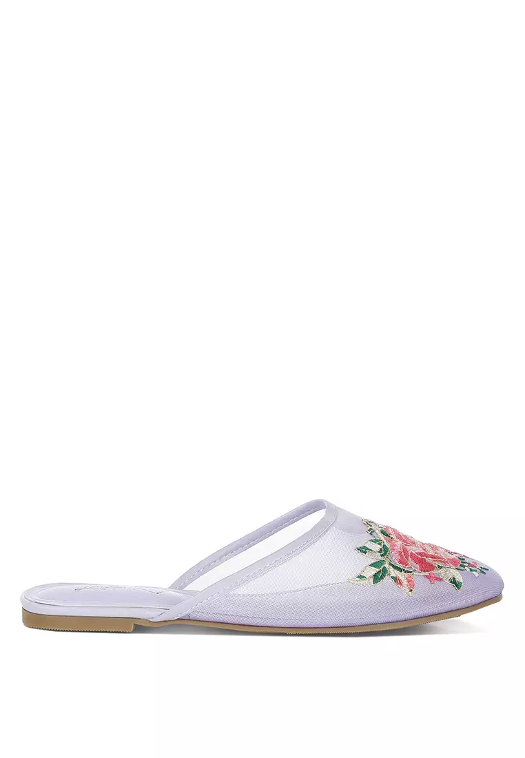 Floral Embroidered Mesh Mules in Lilac
