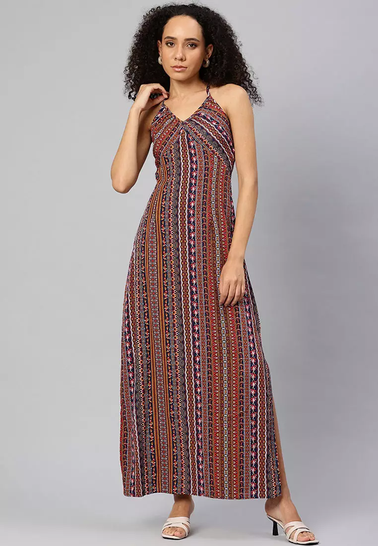 Gaun Maxi Belahan Samping Belakang Silang Warna Multi
