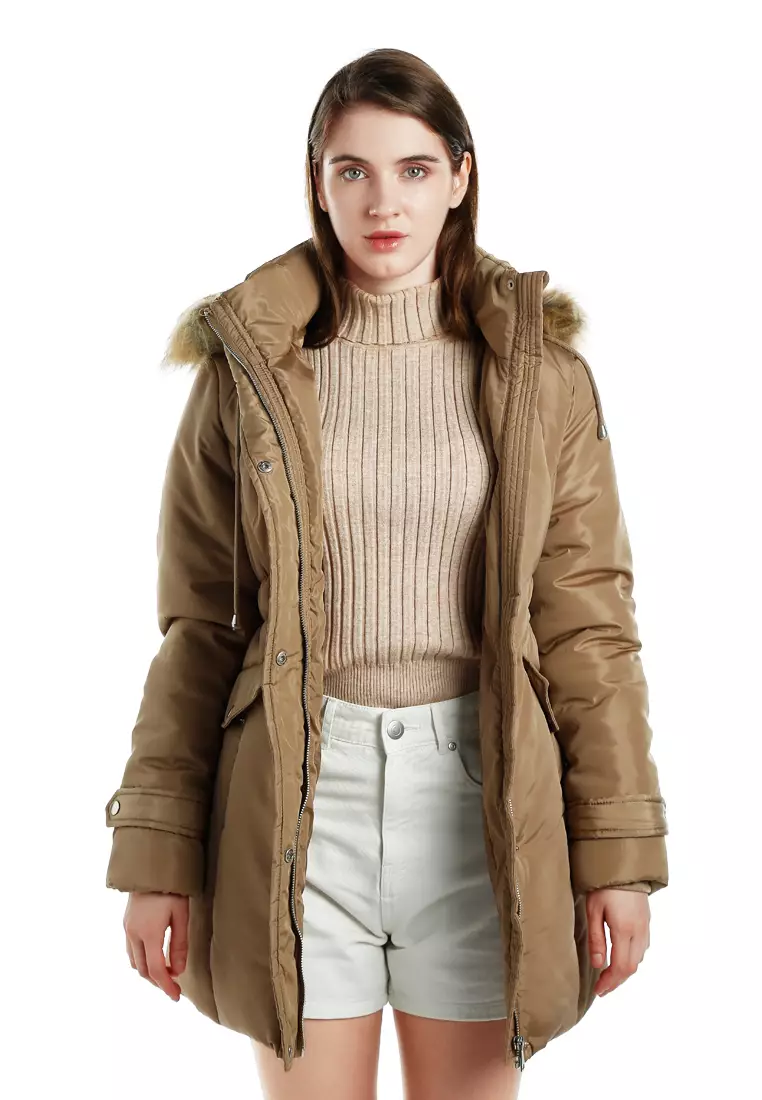 Jaket Panjang Berkerah Bulu Palsu Warna Beige