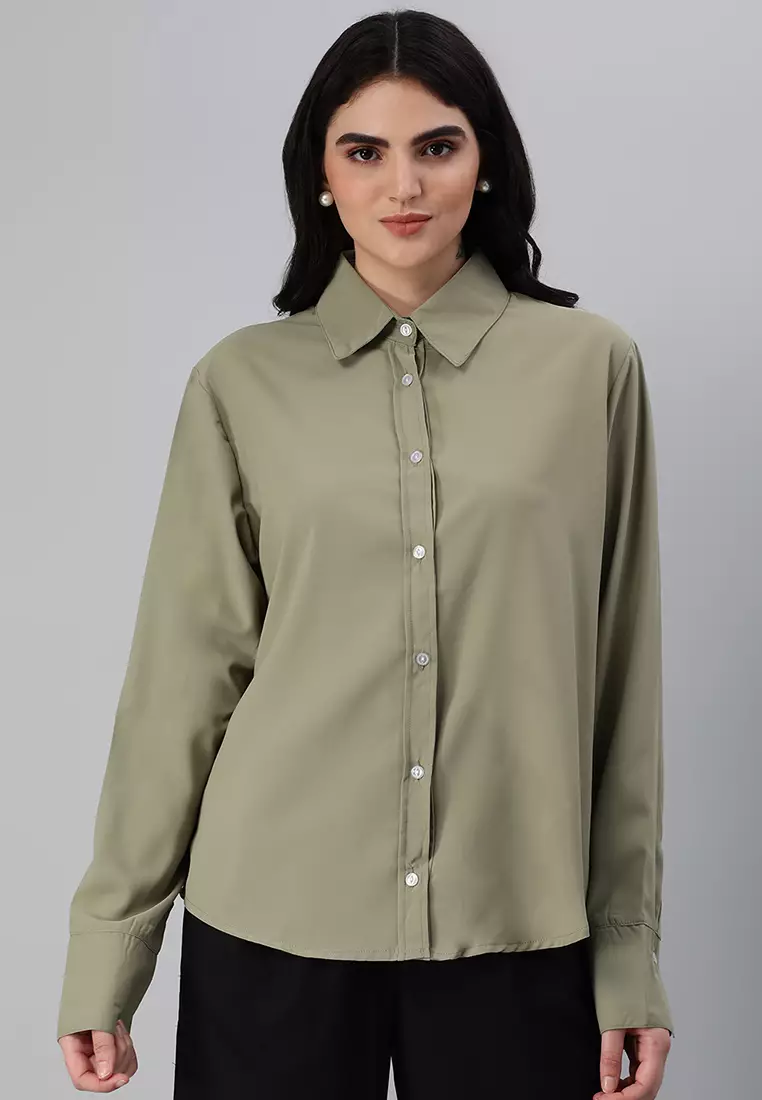Kemeja Kerah Lengan Panjang Dasar Hijau Sage