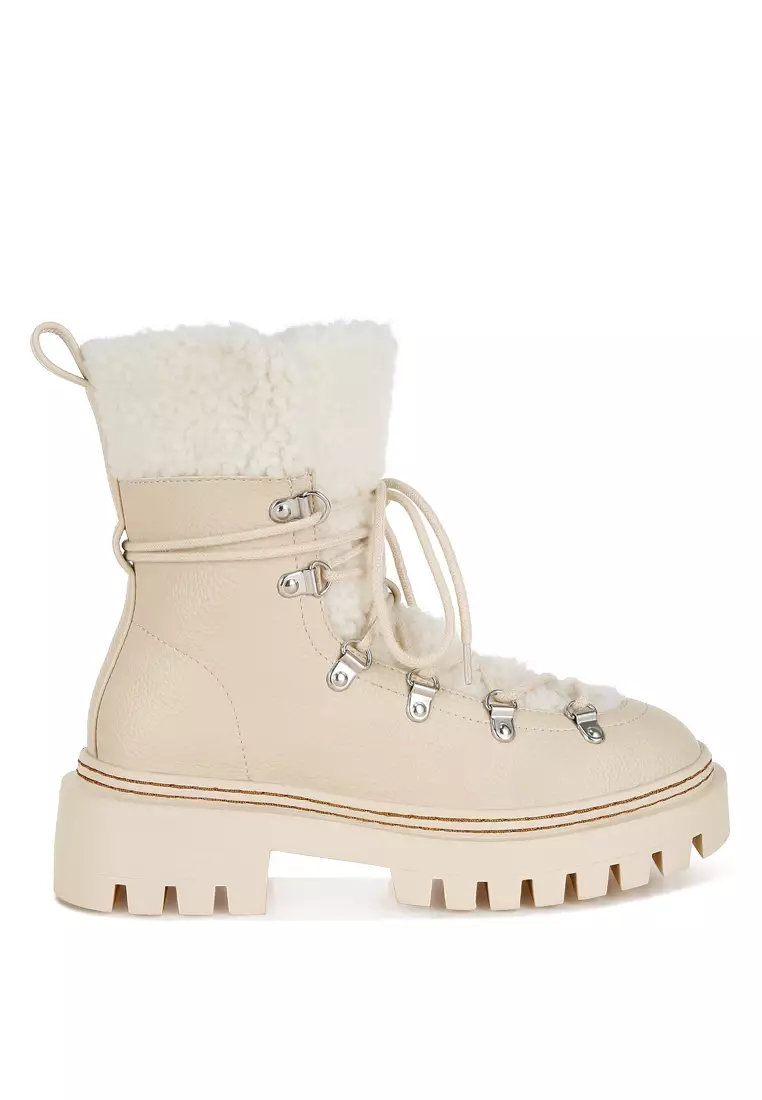 Sepatu bot bulu domba dan kulit imitasi berwarna putih pucat