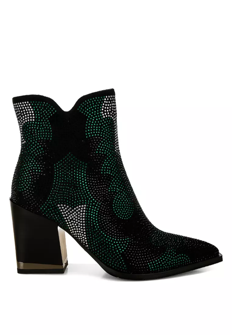 Sepatu bot hak blok berhias berlian imitasi berwarna hijau
