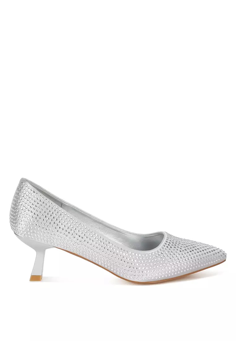 Sepatu hak anak kucing berhiaskan berlian imitasi berwarna perak
