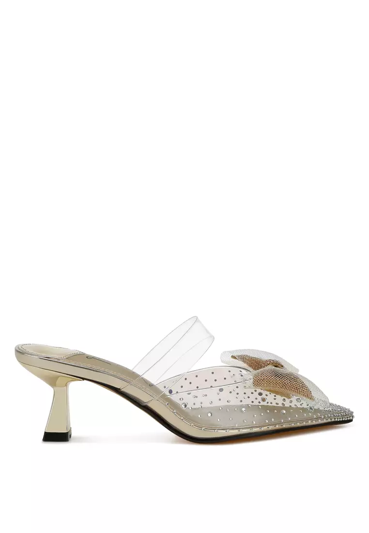 Sepatu Hak Kucing Busur yang Dihiasi dengan Warna Emas