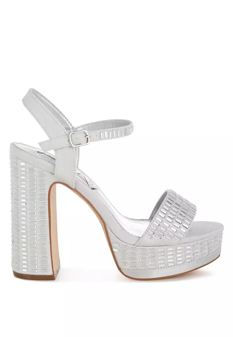 Sepatu hak tinggi blok berhias berlian imitasi berwarna perak