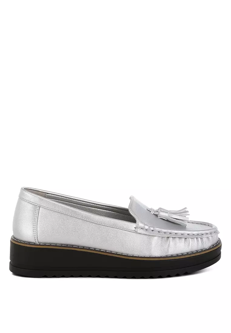 Sepatu Loafer Berdetail Rumbai Metalik Warna Perak