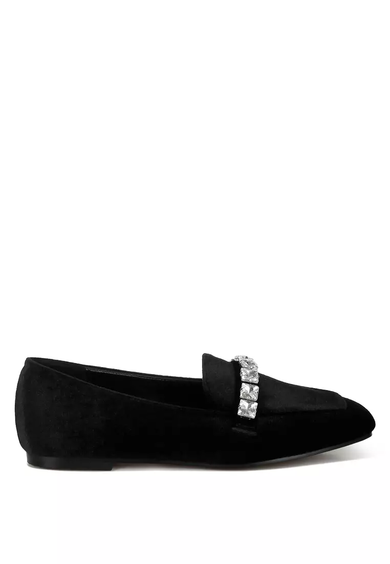 Sepatu Loafer Tali Berlian Beludru Warna Hitam