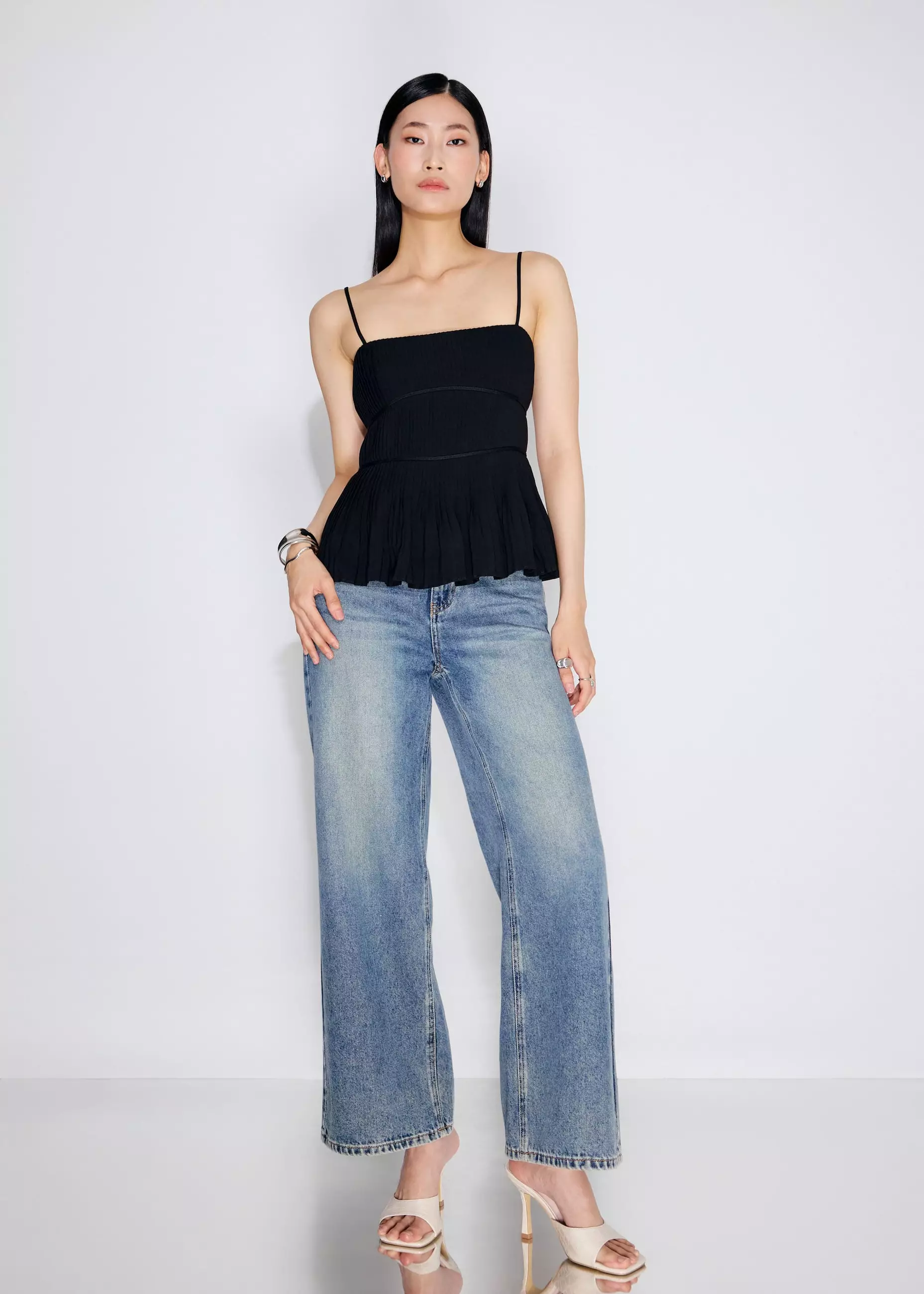 Atasan Wanita - Pleated Straight Neck Peplum Camisole Top