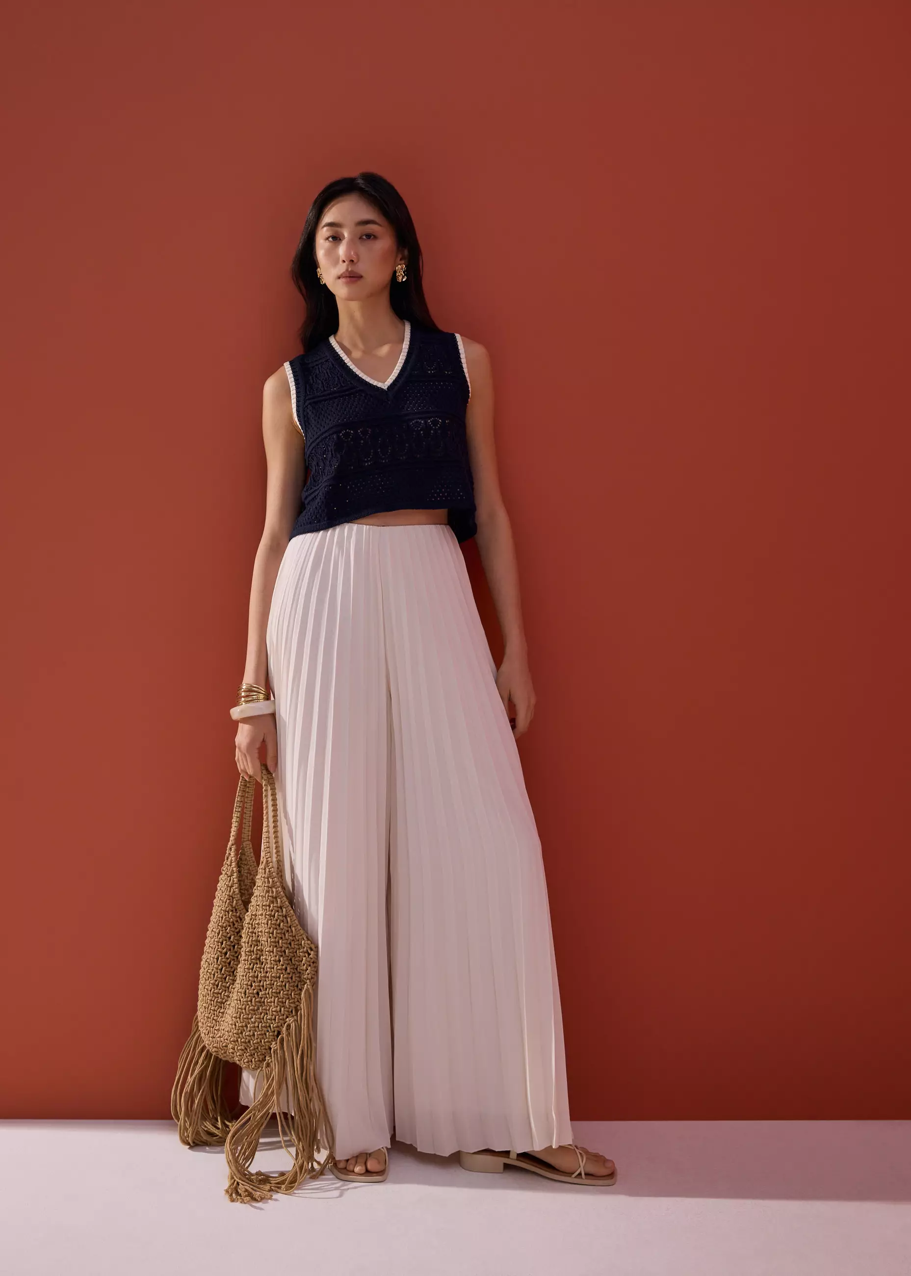 Atasan Wanita - Pointelle Contrast Knit V-neck Crop Shell Top