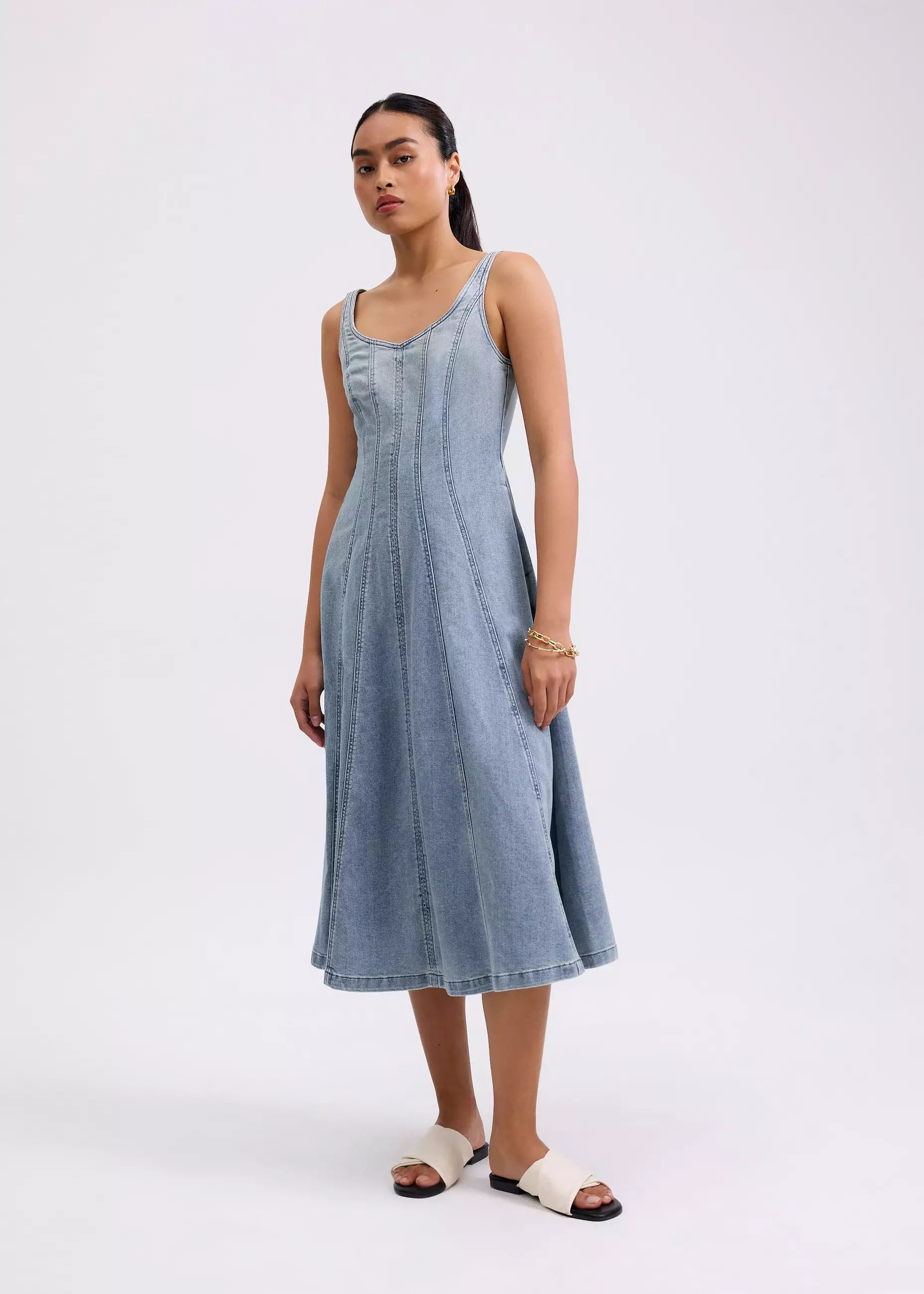Dress Wanita - Denim Panelled Sweetheart Midi Dress