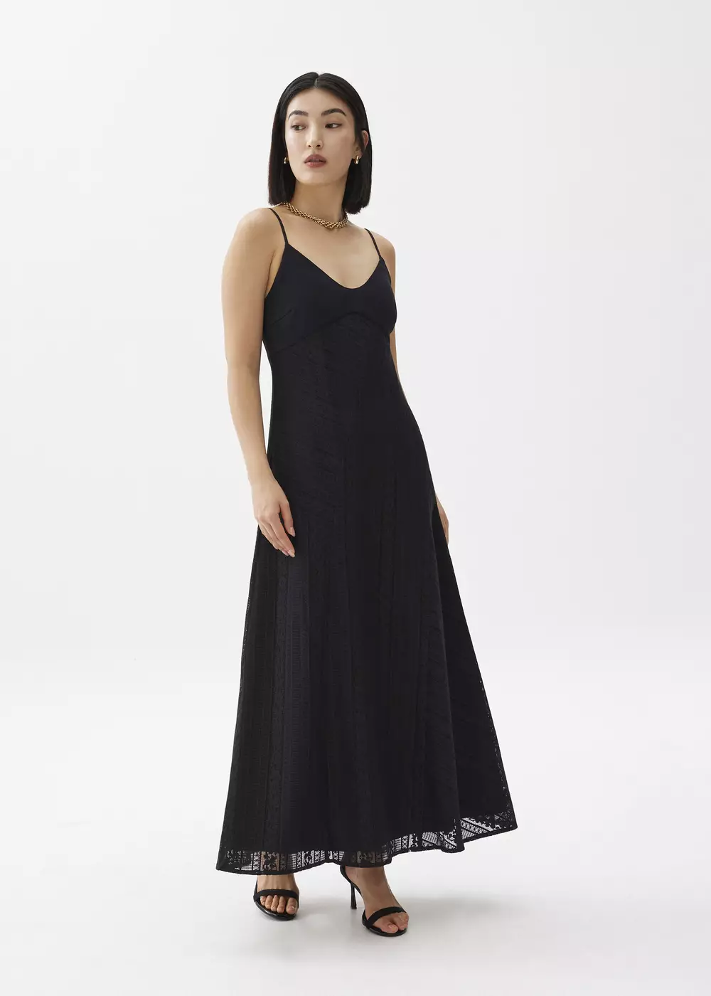Dress Wanita - Padded Lace V-Neck Flare Maxi Dress