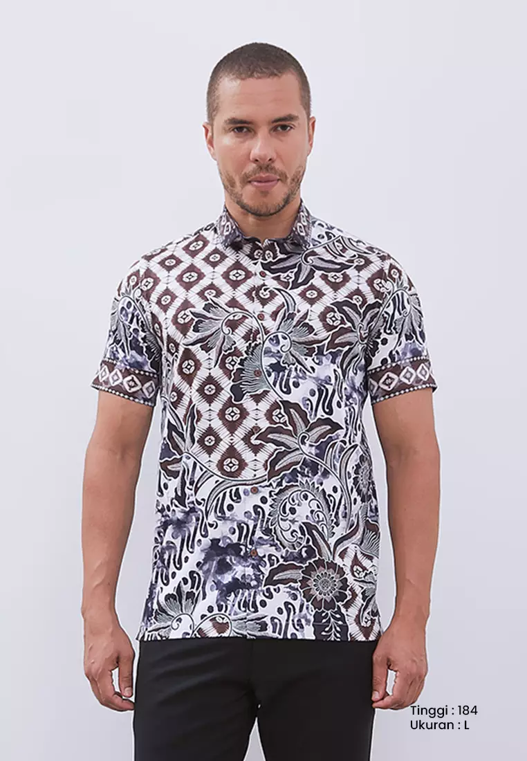 MANZONE - Kemeja Batik Lengan Pendek Pria Barata Comfort Fit - Brown Warna White