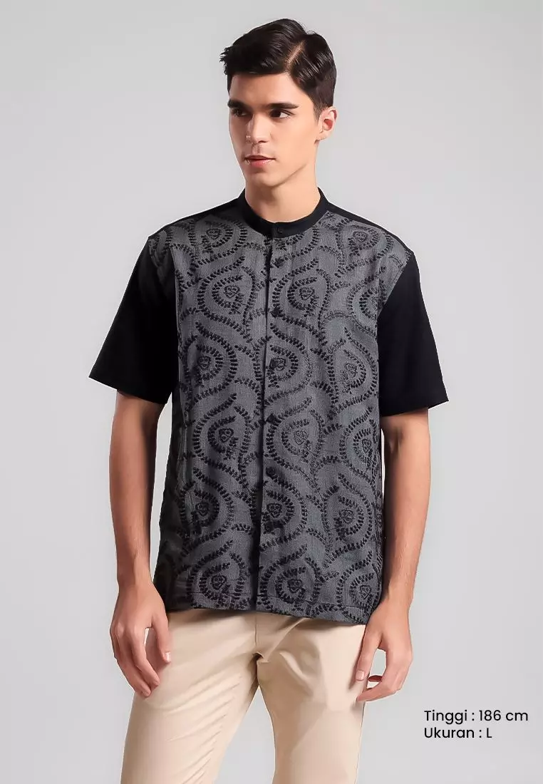 MANZONE - Kemeja Koko Lengan Pendek Pria Raggan Comfort Fit - Black Warna Black