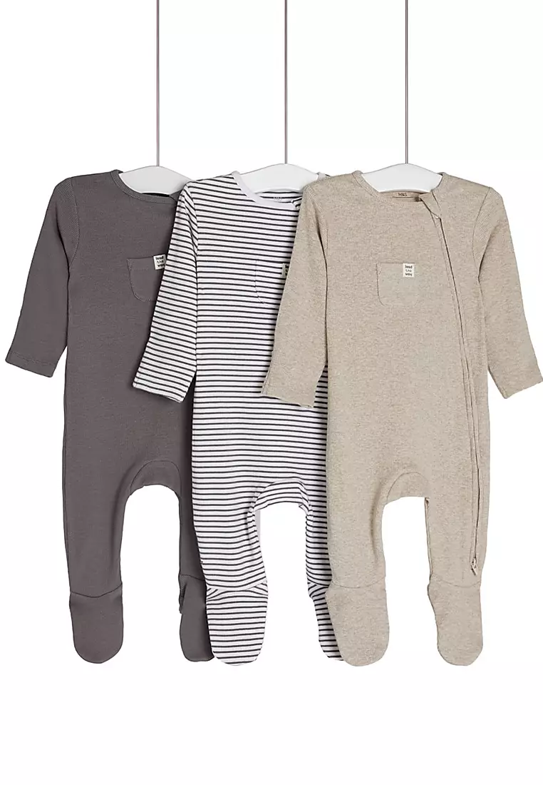 3pk Cotton Rich Striped & Plain Sleepsuits