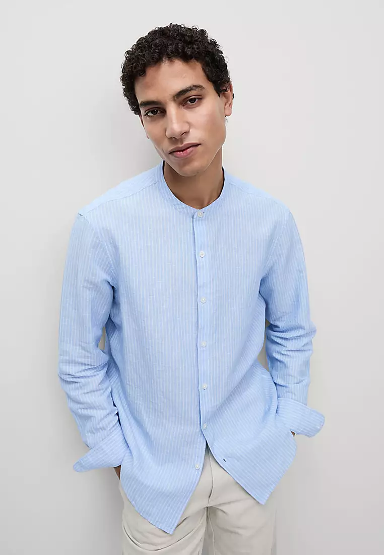 Cotton Linen Blend Striped Grandad Collar Shirt