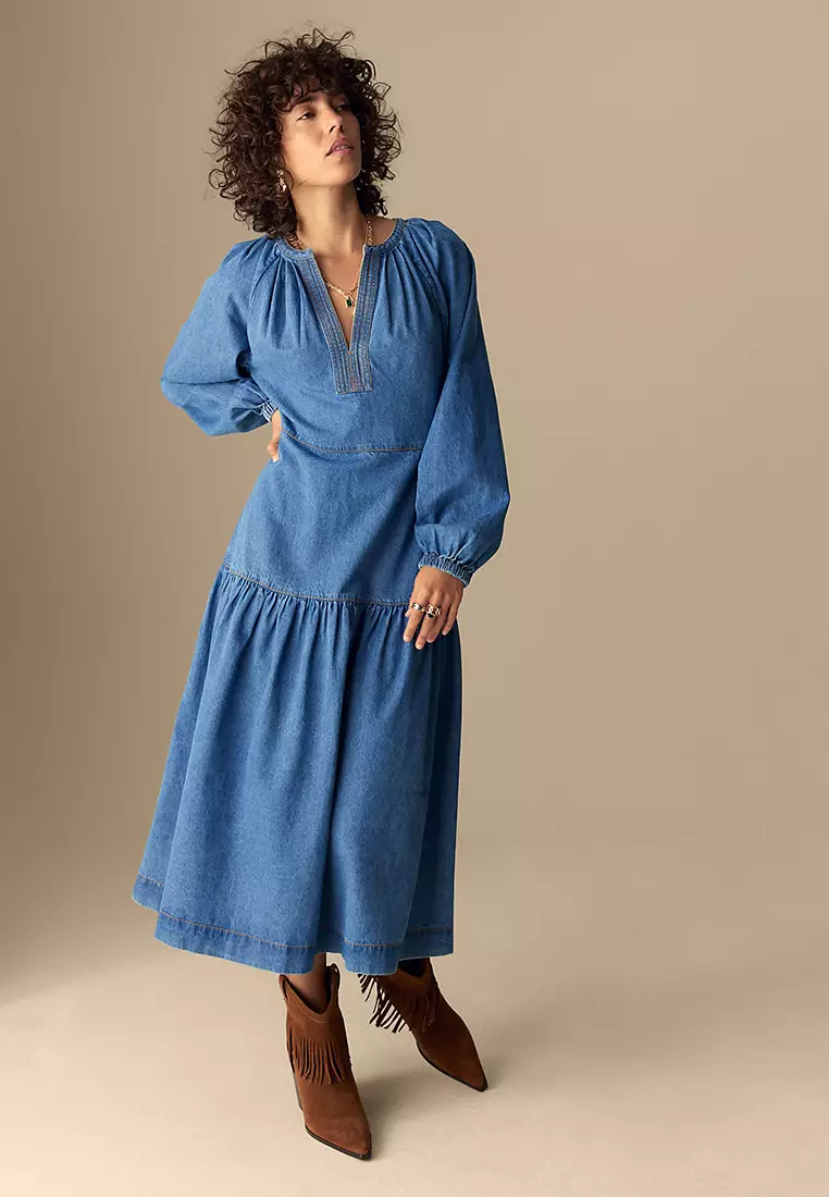 Denim V-Neck Midi Tiered Waisted Dress