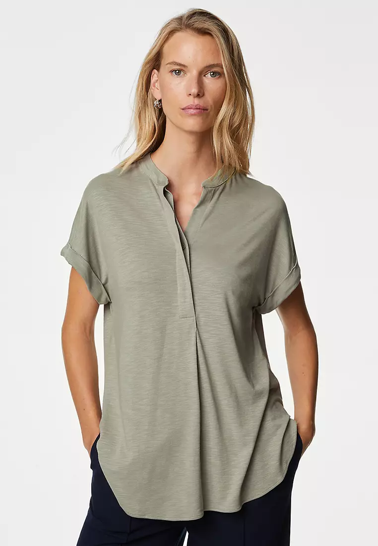 - Leher: Kerah Mandarin