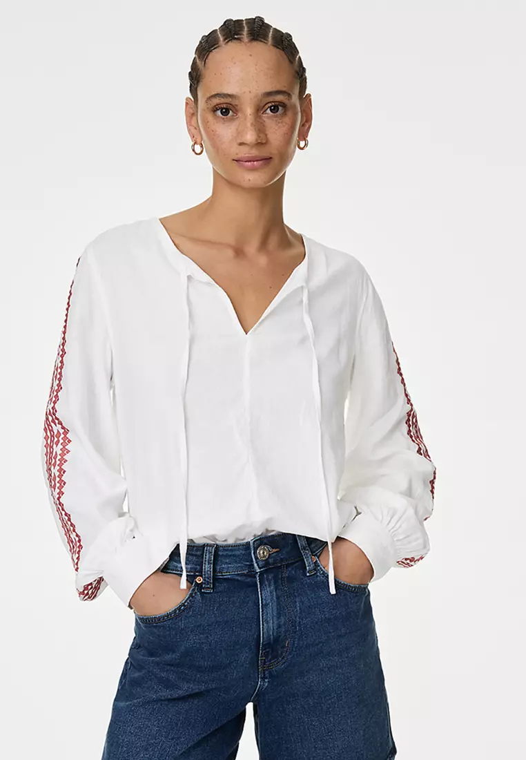 Marks & SpencerLinen Blend Embroidered Tie Neck Blouse949900.00