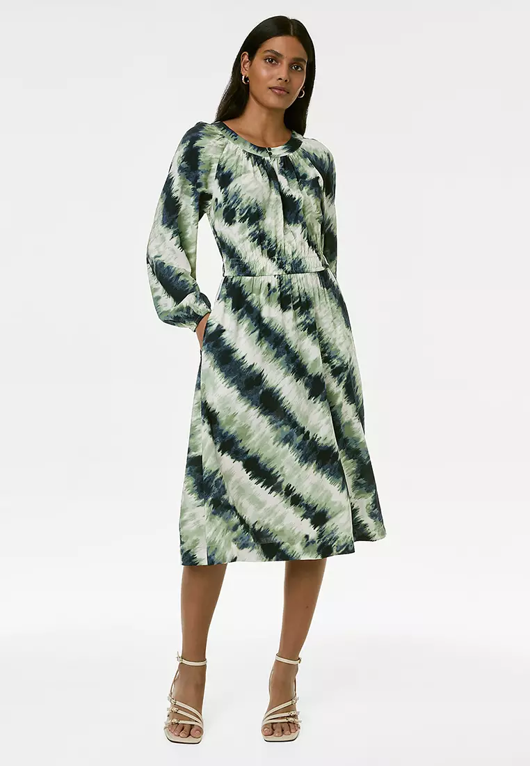 Printed Keyhole Pleated Midi Waisted Dress