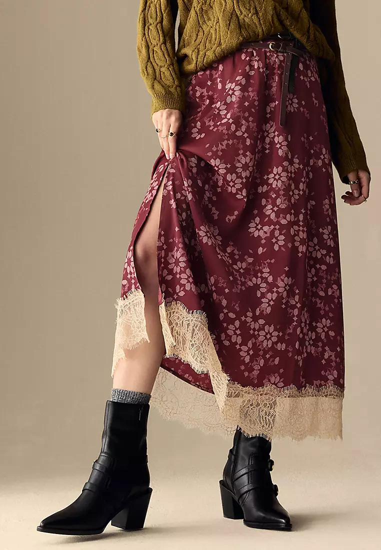 Satin Geometric Lace Detail Midaxi Slip Skirt