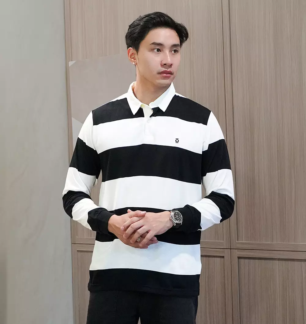 Matsuda Kaos Rugby Polo Shirt Katun Pria Lengan Panjang Nagai Black White