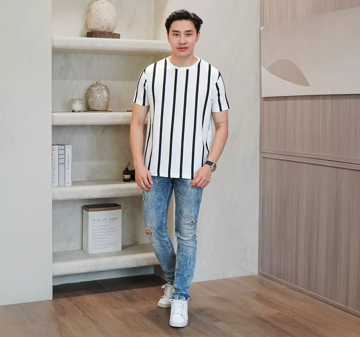 Matsuda T Shirt Pria Kaos Stripe Tsuru White