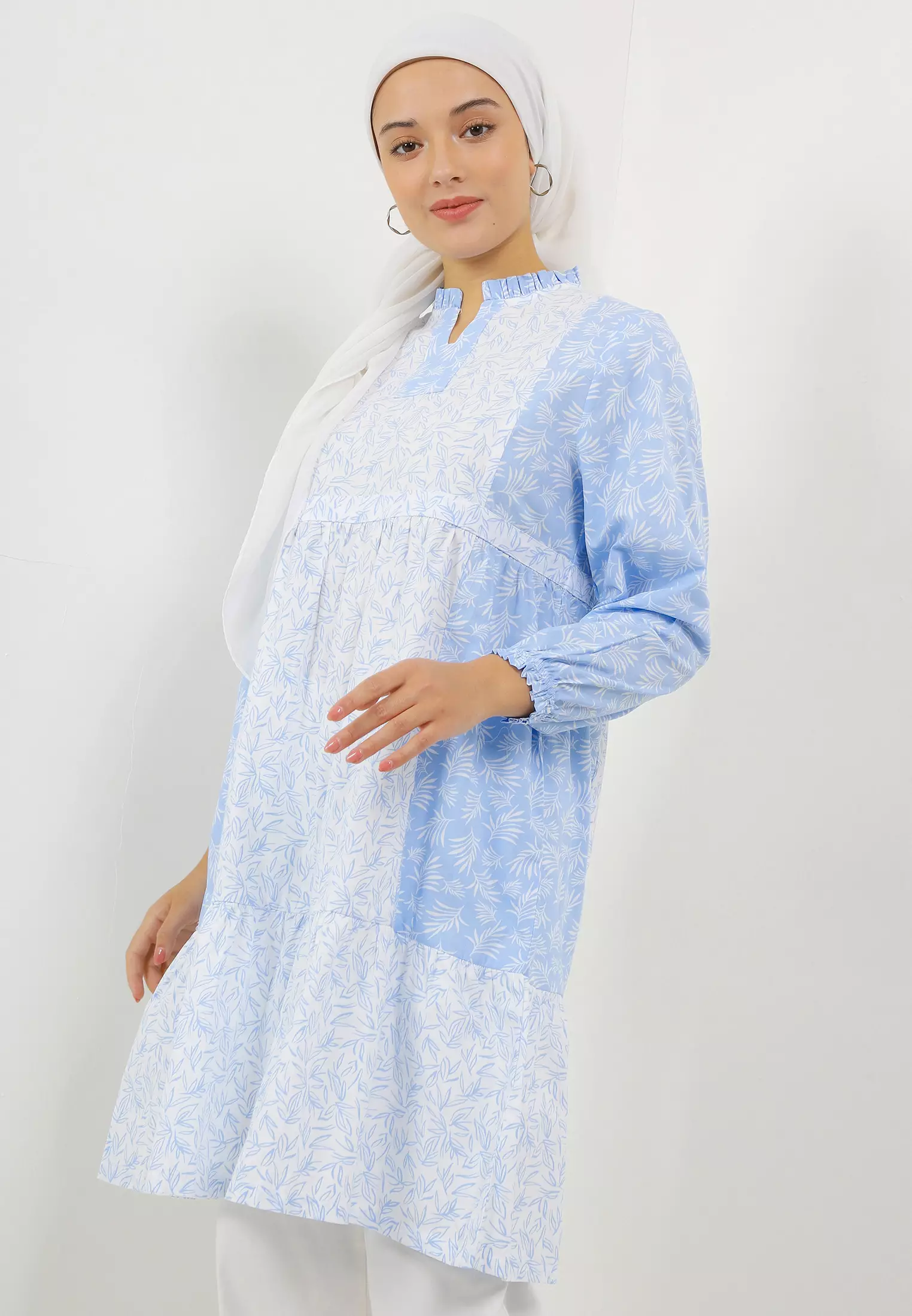 MFMW Amon Tunik Putih Motif Daun Biru