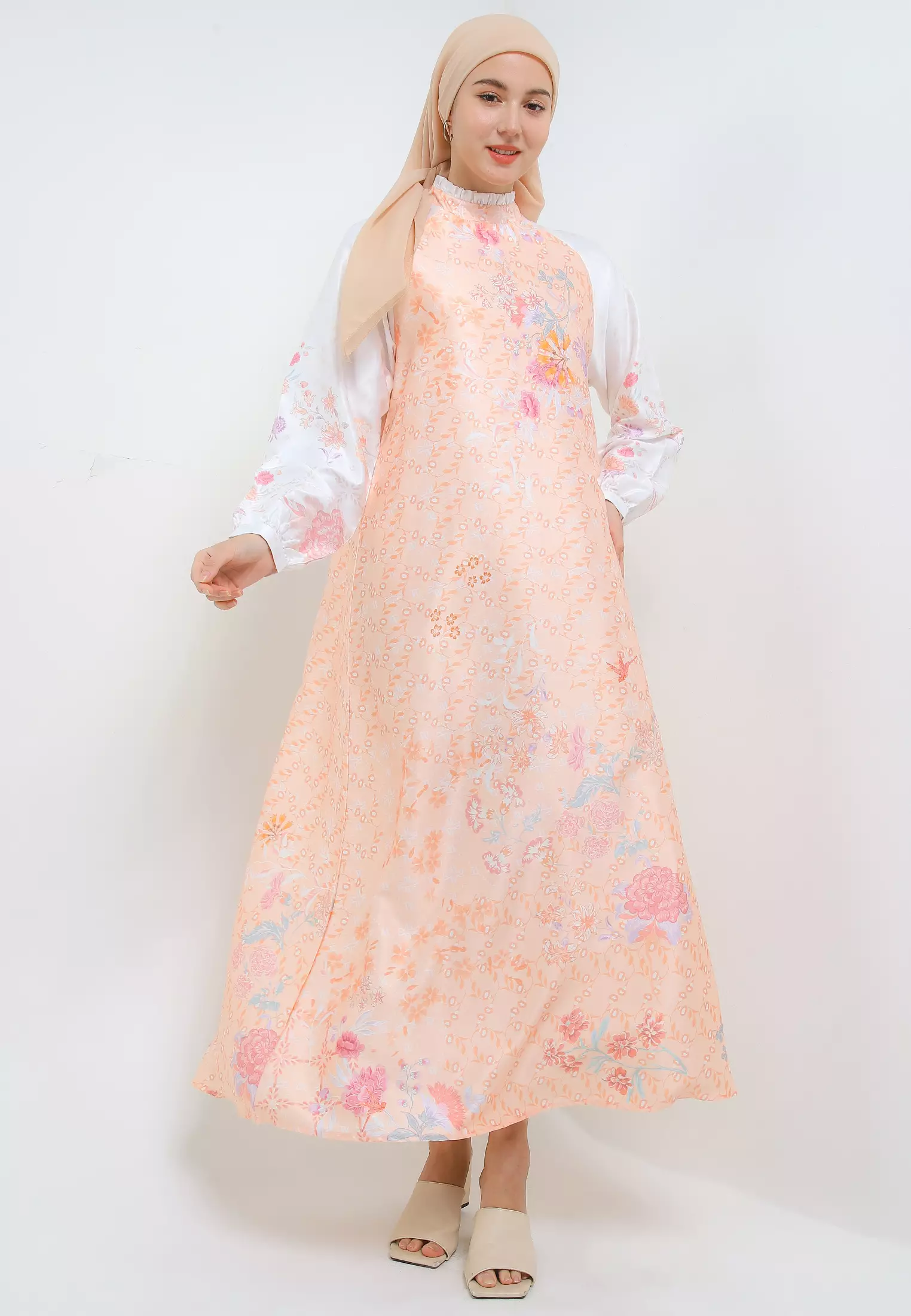 MFMW Shevarta Dress Gamis Satin Peach Fuzz Motif Bunga