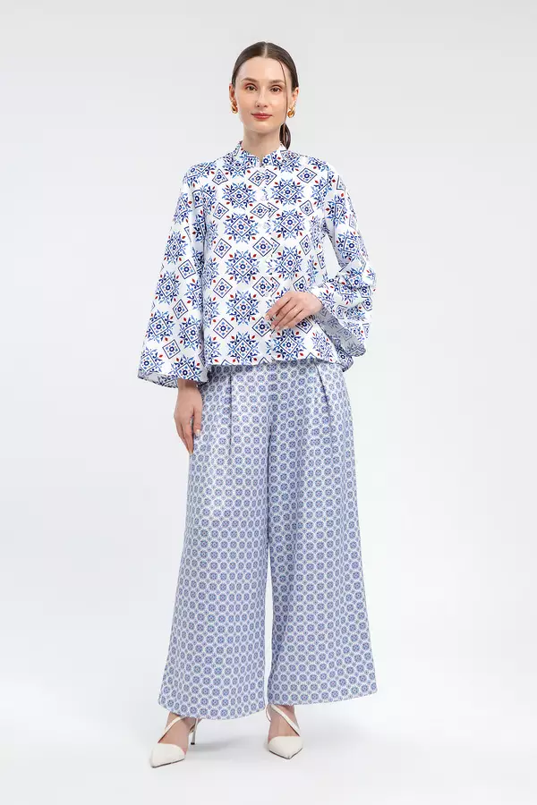 MINIMAL - Karina - Blus Lengan Lebar Motif Geometris - Blue Warna Blue