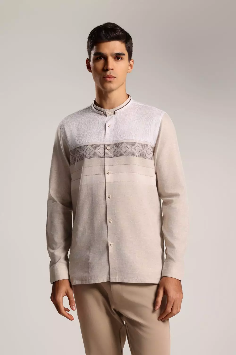- Leher: Kerah Mandarin