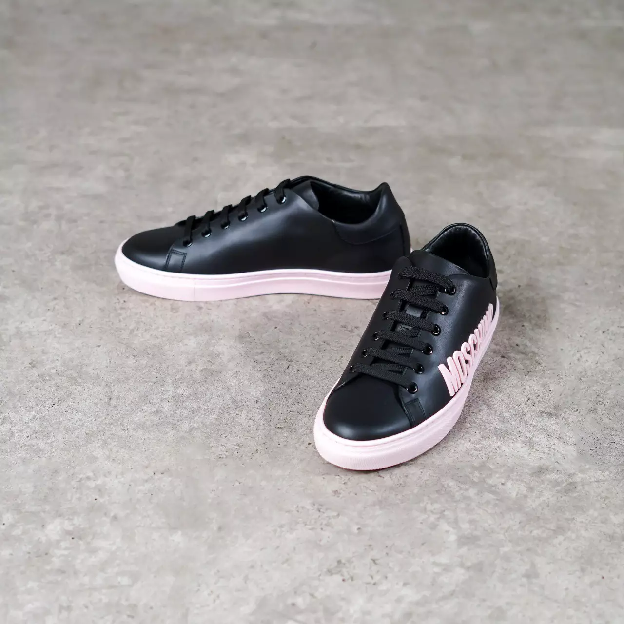Sepatu MOSCHINO TEXT SIDE BABY PINK EMBOSSED BLACK LEATHER SNEAKER 100% ORIGINAL