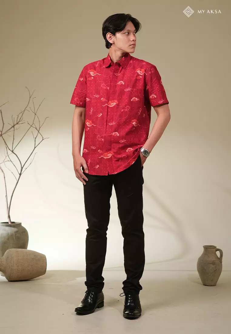 My Aksa Batik Pria Kemeja Pendek Slimfit Pelana Merah