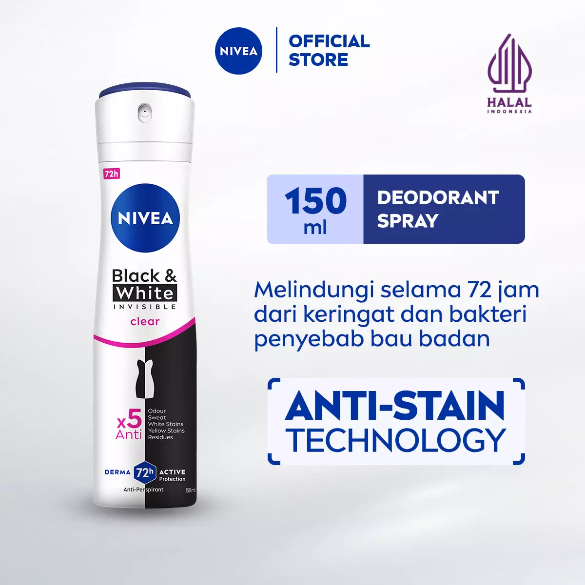 1 x NIVEA Deodorant Invisible Black & White Spray 150ml, , NIVEA Men Deodorant Invisible Black & White Spray dengan Teknologi Pencegah Noda (Anti-Staining Technology) mencegah residu menempel di baju. Baju hitam akan tetap hitam dan baju putih aka