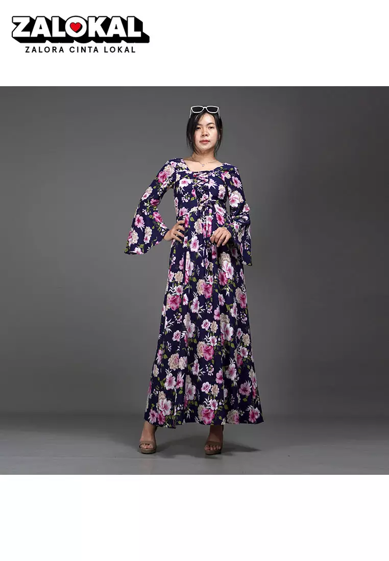 OkechukuCLOVERIA Long Dress Motif Bunga Gaya Korea Dress Wanita Korean Style - Navy249900.00175000.00