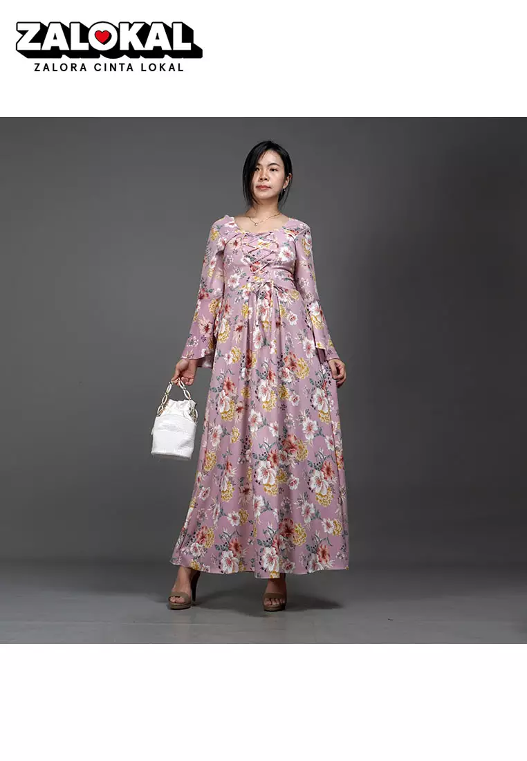 CLOVERIA Long Dress Motif Bunga Gaya Korea Dress Wanita Korean Style - Pink