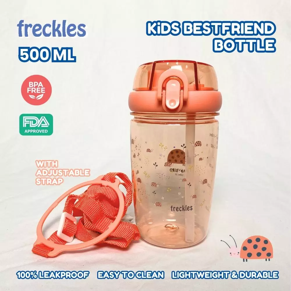Freckles kid Bestfriend Bottle 500ml - Lady Bug Coral - Botol anak unik dengan 2 sedotan