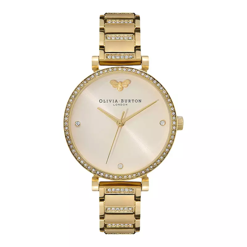 Jam Tangan Wanita Olivia Burton Belgrave 24000002 Tbar Nude Sunray Dial Gold St. Steel With Crystals Bracelet Strap