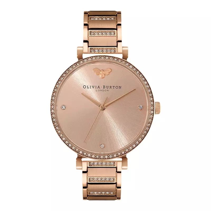Jam Tangan Wanita Olivia Burton Belgrave 24000003 Tbar Blush Sunray Dial Rose Gold St. Steel Crystals Bracelet Strap