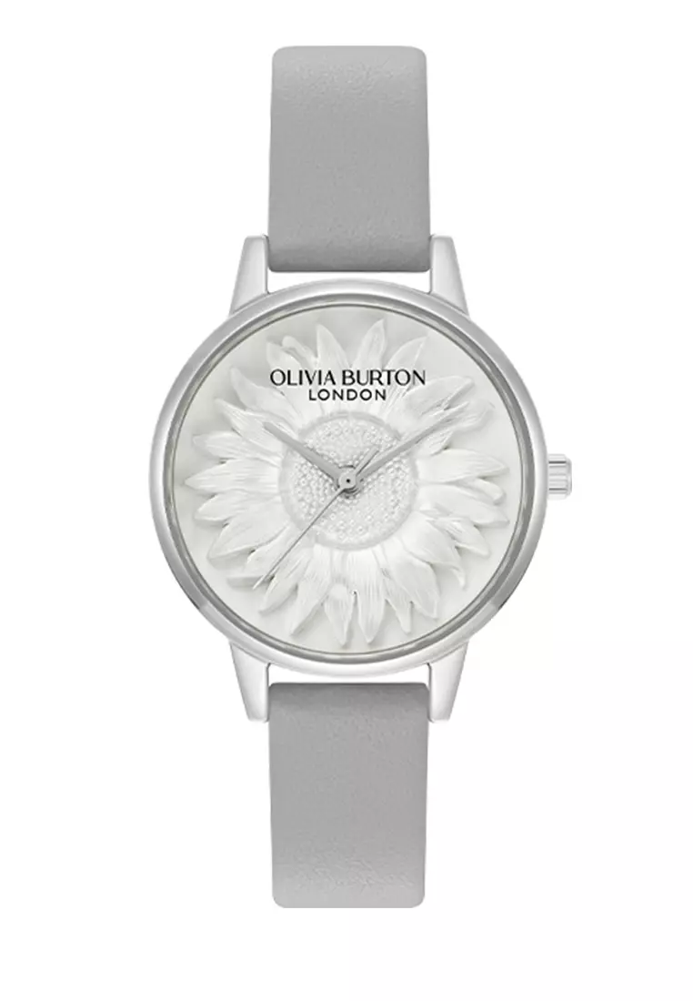 Olivia Burton 3D Flower Tonal Dial Grey Leather SS Strap 30mm - 24000223