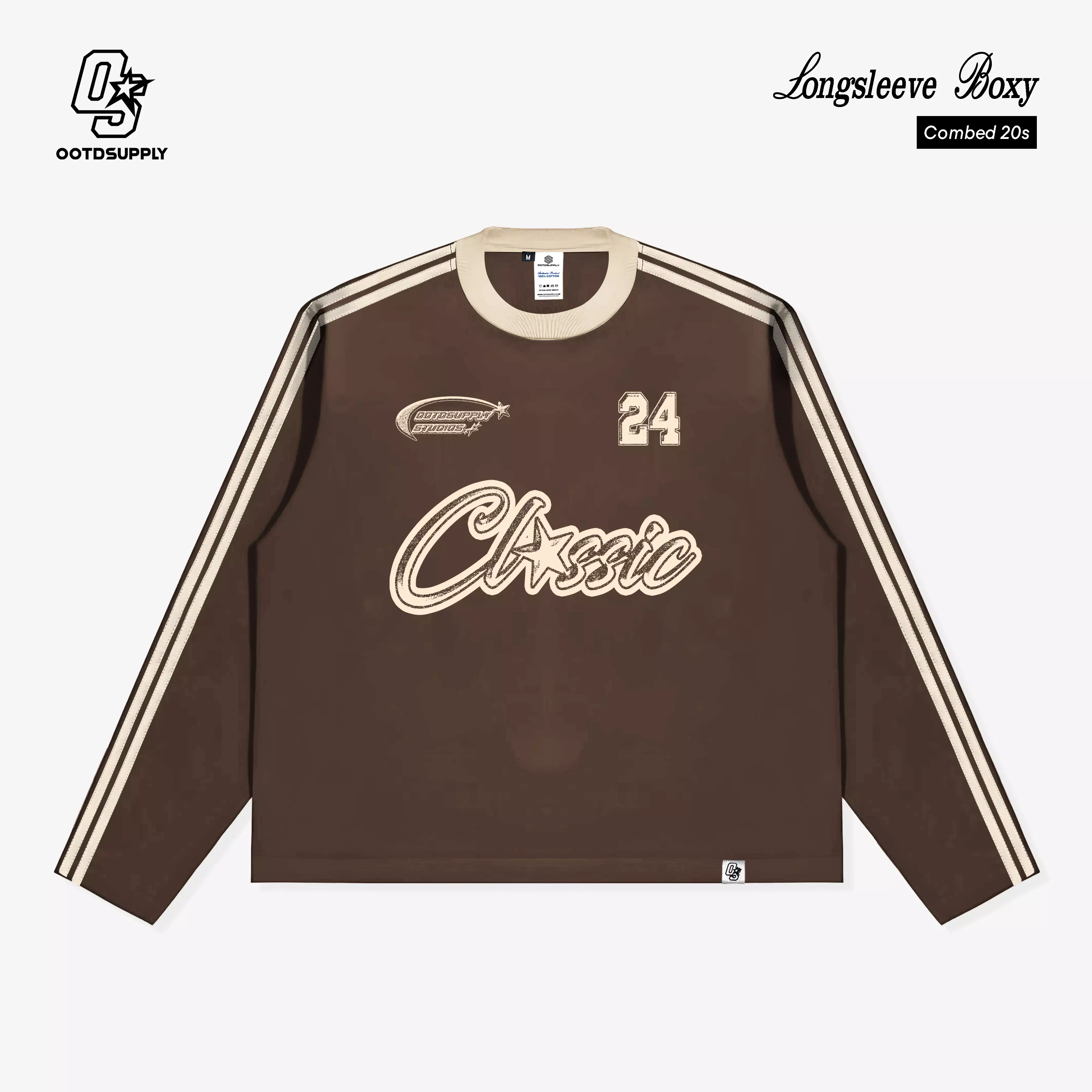OOTDSUPPLY Longsleeve Boxy Double Stripe Classic 24 White & Dark Brown l Oversize T-Shirt Lengan Panjang l Kaos Kerah I Kaos Stripe | LSBX001
