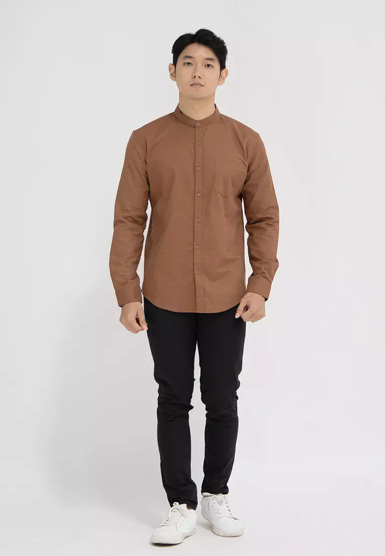 Kemeja collarless koko Slub coklat OXCON walnut brown