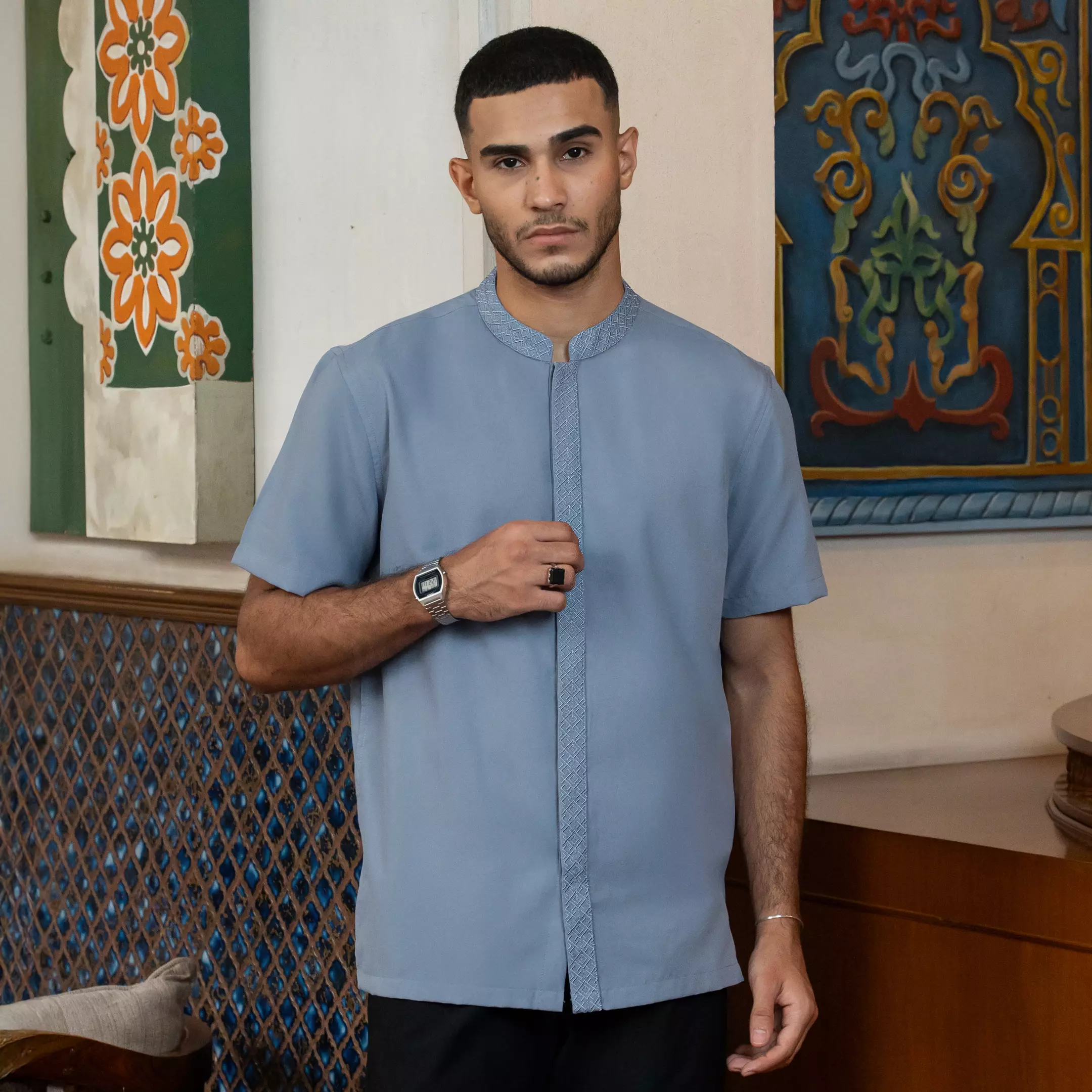 Kemeja Koko Bordir Azril Tangan Pendek Pria Muslim Blue Grey