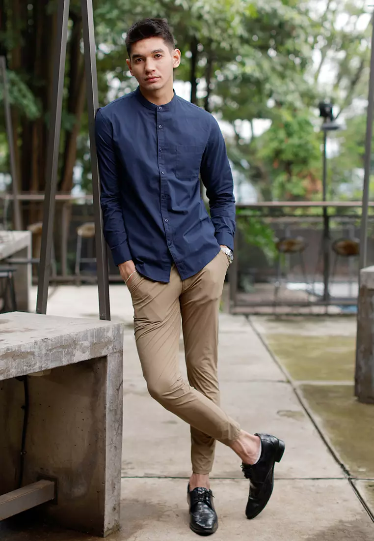 Oxcon Collarless Long Sleeve Business Shirt soft cotton Navy